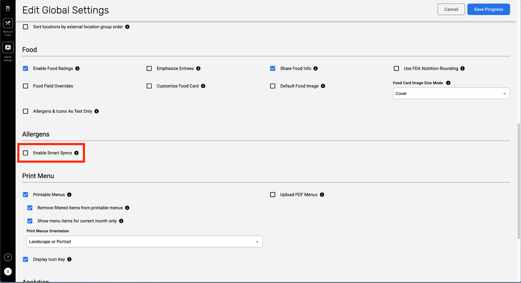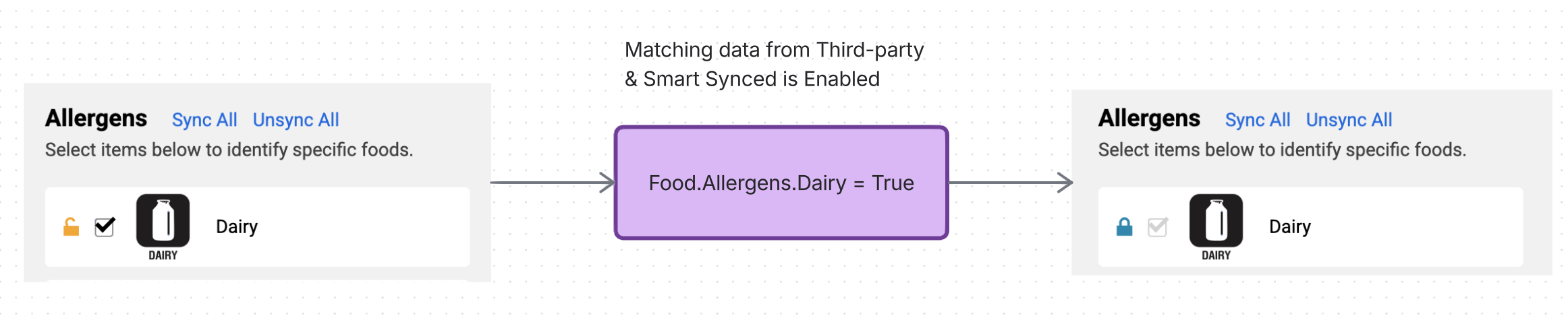 | Enable Smart Syncs | Toggle switch. When ON, any matching allergen information from your integration will automatically be re-synced to the food going forward. Tooltip: Any matching information between your integration and allergen settings will be automatically synced. |