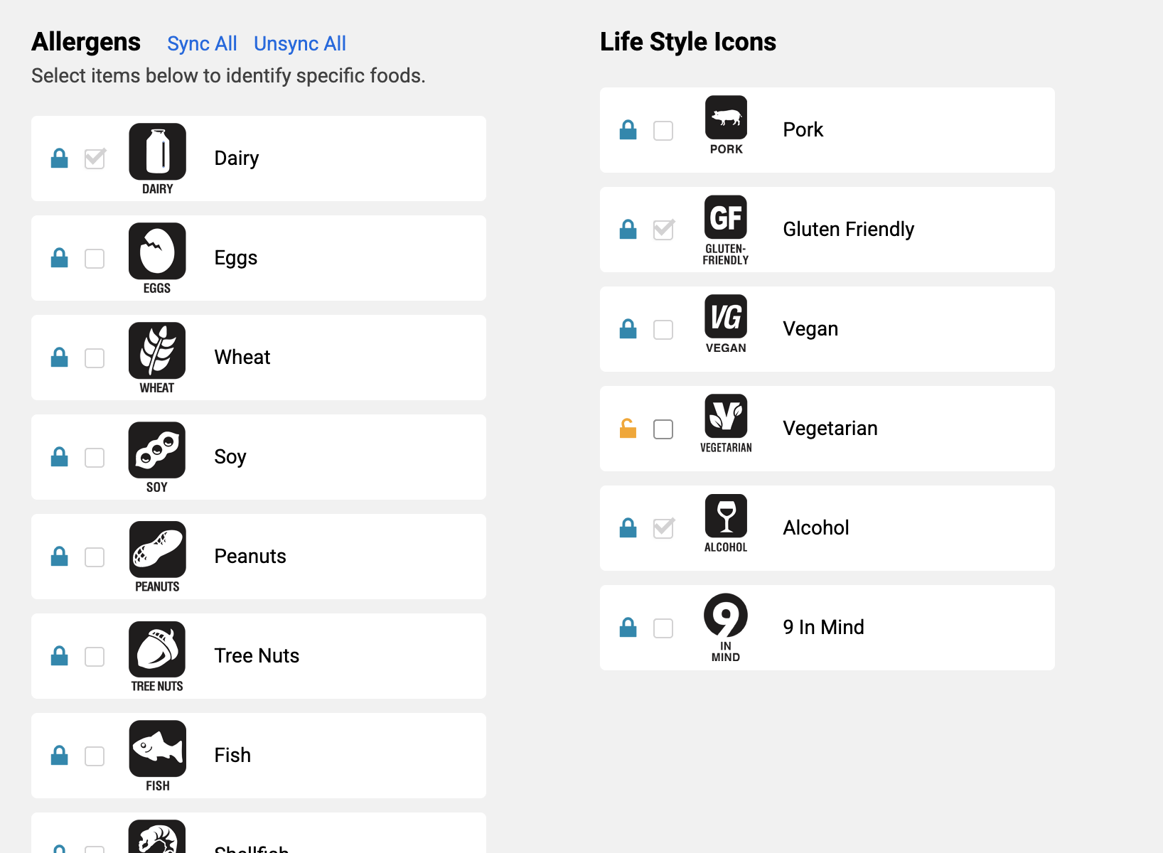 On the Food Edit page, the Allergens section shows each allergen with a lock icon indicating its sync status. You can now sync or unsync allergens individually, as well as all at once using the Sync All / Unsync All controls.